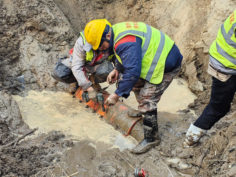 搶修現(xiàn)場,因管線漏水導(dǎo)致路面塌方嚴重,確認漏點后,搶修人員緊急制定搶修方案,同時給下游客戶下停水通知。受現(xiàn)場施工條件所限,挖掘機清理完上層堅硬的砂石后,剩下的泥土只能用鐵锨一點點挖出。為縮短搶修時間,隊員們冒著零下8℃低溫天氣,全然不顧被泥水打濕的衣服和鞋子,站在冰冷刺骨的泥水里,徒手安裝螺栓。經(jīng)過5小時的連續(xù)奮戰(zhàn),最終比計劃時間提前4小時完成搶修,把因停水給居民帶來的影響降至最低,過往群眾紛紛為搶修隊員點贊。