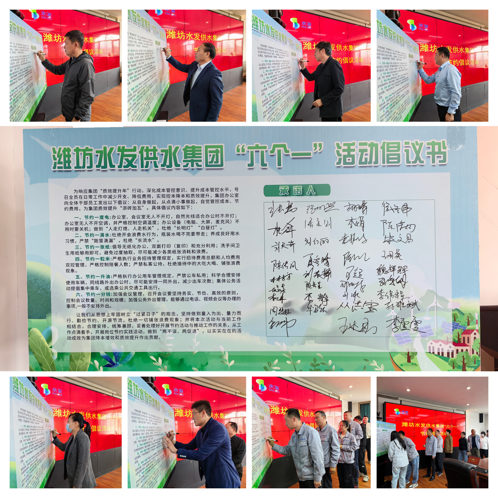 會(huì)上,供水集團(tuán)黨總支書記、董事長張勇首先宣讀了“六個(gè)一”活動(dòng)倡議書,號召全體員工提升降本增效意識,爭做勤儉辦公、節(jié)能降耗的先進(jìn)模范。隨后,供水集團(tuán)領(lǐng)導(dǎo)班子成員及參加活動(dòng)的干部職工紛紛在活動(dòng)展板上簽上自己的名字,承諾自覺踐行“六個(gè)一”節(jié)約倡議。