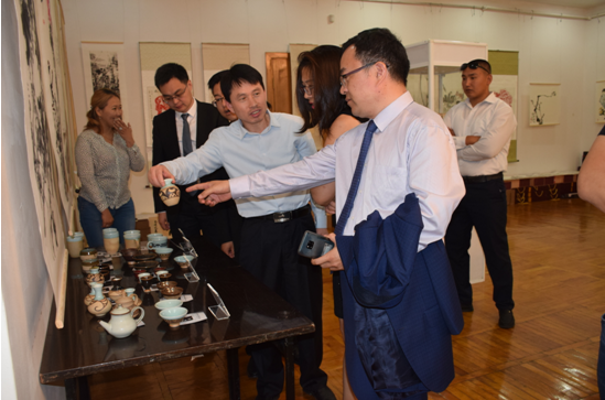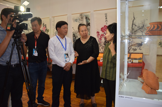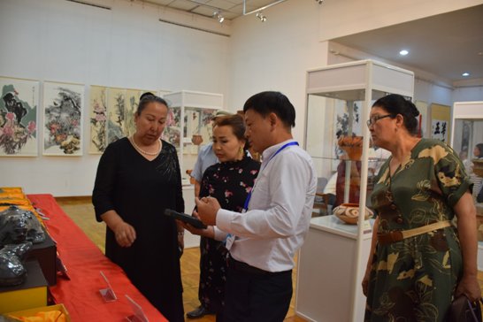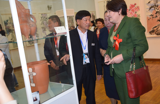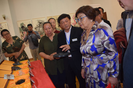 公司總經理劉新安為吉爾吉斯斯坦前總統奧通巴耶娃講解黃河澄泥硯《九九歸一硯》